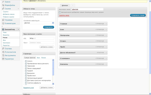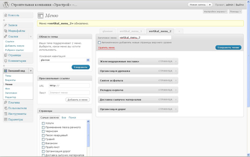 Ах да, чуть не забыл, зайдите в папку шаблонов WordPress («wp-content\themes») и скопируйте с папки «twentyten» файлы: «404.php», «functions.php», «comments.php» и папку «languages». Всё, шаблон готовый. Берём всю папку «era_stroy» и переносим в папку шаблонов. Устанавливаем WordPress, активируем шаблон и вуаля, практически всё работает. Но без ложки дёгтя в бочке мёда не обошлось. У каждого меню есть свое имя и теперь каждое меню нужно сформировать, сперва забив нужные страницы.
